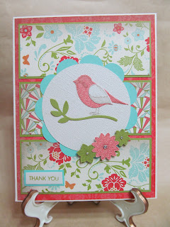 Bird Thank You Card Supplies: Ivory cardstock, vintage floral designer series paper by Stampin' Up!, pool party and lucky limeade cardstock by Stampin' Up!, pearl white gemstone cardstock by Core'dinations, Cricut machine (2 1/2" circle and floral image), Cricut cartridge (George and Basic Shapes and Straight from the Nest), bird builder punch (117191) and boho blossoms punch (119858) by Stampin' Up!, language of friendship stamp set by Stampin' Up! (122752), classic stampin' pads in crumb cake and lucky limeade, rhinestones, and dimensionals.