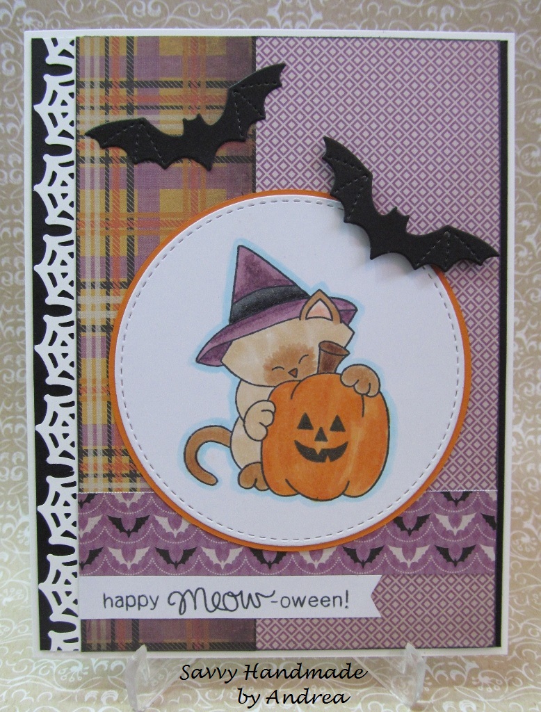 Hello and Happy Monday! There is only a week left until Halloween and I still need a couple of cards to put in the mail for my family. So, I combined a few challenges and made this Happy Meow-oween Card.