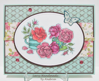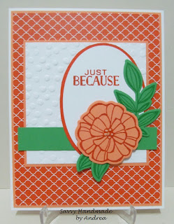 My first card features the kangaroo image, I really wanted to use my sentiment that says "You are my sunshine," but it was too large for the sentiment area. So, I went with the sentiment "Hey there, Sunshine!" by Verve Stamps. The die cut stitched 1.5" sunshine is by Lil' Inkers and all the patterned paper is from the retired Cherry on Top paper stack by Stampin' Up!